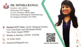 Dr. Monika Bansal MBBS, MS ENT is a leading ENT specialist with extensive experience in providing comprehensive ENT health service. Her dedication to patient care, particularly for those suffering from ear pain, ringing in ear. throat pain, tonsillitis, nose blockage, snoring, is evident in every aspect of her practice at Shankari ENT Clinic. Additionally, she has expertise in endoscopic surgery and managing issues like nose congestion, blockage, ear surgery, tonsillitis and offers specialized pediatric ENT care, ensuring that patients of all ages receive the best treatment.